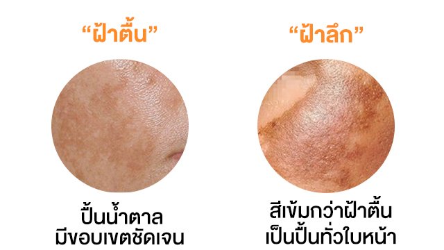 ฝ้าแดด และฝ้าฮอร์โมน หากเกิดที่บริเวณผิวชั้นหนังกำพร้า (Epidermis) จะจัดเป็น “ฝ้าตื้น” แต่หากเกิดที่ผิวชั้นหนังแท้ (Dermis) จะจัดเป็น“ฝ้าลึก”