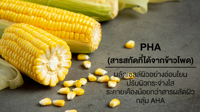 PHA หรือกรด Polyhydroxy acids เป็นสารสกัดที่ได้จากข้าวโพด ด้วยกระบวนการหมัก (Fermentation) มีคุณสมบัติในการผลัดเซลล์ผิวอย่างอ่อนโยน ระคายเคืองน้อยกว่าสารผลัดผิวกลุ่ม AHA BHA เนื่องจากมีขนาดโมเลกุลใหญ่กว่า ช่วยผลัดฝ้าออกไปจากผิว พร้อมเผยผิวขาวกระจ่างใสไร้ฝ้า