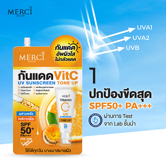 ครีมกันแดดของเมอร์ซี่ปกป้องผิวยาวนานตลอดทั้งวัน ด้วยค่า SPF50+ PA+++ ยืนยันด้วยผลทดสอบจาก Lab ชั้นนำ ปกป้องผิวได้ครบทุกรังสี ไม่ว่าจะเป็นรังสี UVA1 UVA2 และ UVB ได้อย่างมีประสิทธิภาพ