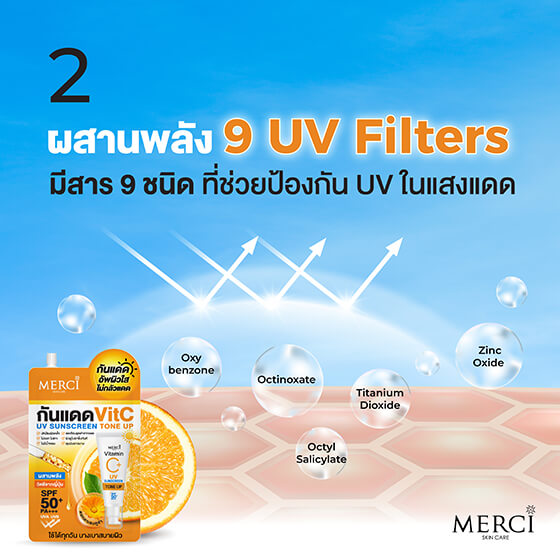 ครีมกันแดดสูตรวิตามินซี จากเมอร์ซี่ ผสานพลังการปกป้องถึง 9 UV Filters นั่นคือ มีสาร 9 ชนิด ที่ช่วยป้องกันรังสี UV ในแสงแดด ได้แก่