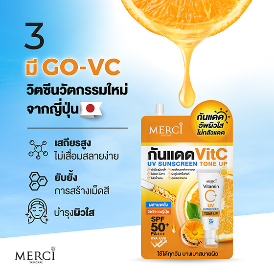 ครีมกันแดดเมอร์ซี่ นอกจากปกป้องผิวขีดสุดด้วยค่า SPF50+ PA+++ ยังมีส่วนประกอบของ GO-VC (Glyceryl Octyl Ascorbate) วิตามินซีเข้มข้น นวัตกรรมใหม่จากญี่ปุ่น ซึ่งมีคุณสมบัติพิเศษกว่าวิตามินซีชนิดอื่นหลายเท่า เช่น