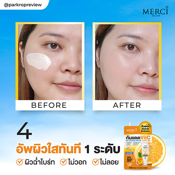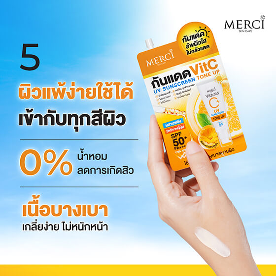 เมอร์ซี่ กันแดดสูตรวิตามินซี เหมาะกับคนผิวแพ้ง่ายสุด ๆ เป็นกันแดดสูตรไม่มีน้ำหอม เนื้อบางเบา เกลี่ยง่าย ไม่มันเยิ้ม ไม่หนักหน้า สามารถกันเหงื่อ กันน้ำได้ระหว่างวัน ไม่เป็นคราบ เข้ากับทุกสีผิว