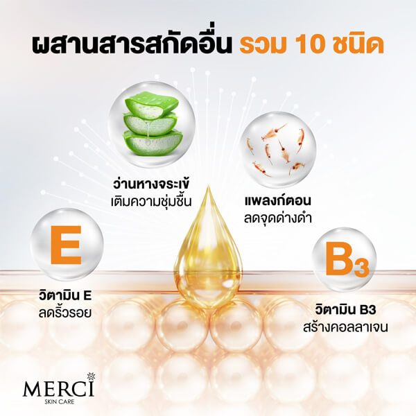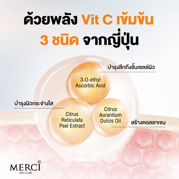“เซรั่มวิตซี” จากเมอร์ซี่ อุดมไปด้วยอนุพันธ์วิตามินซีเข้มข้นถึง 3 ชนิด นำเข้าจากญี่ปุ่น ได้แก่