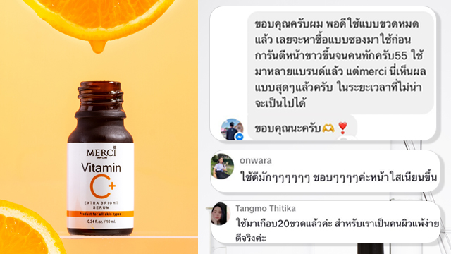 98% ของผู้ใช้จริงกล้าบอกต่อและกลับมาซื้อซ้ำ โดยพบว่า หลังใช้ “เมอร์ซี่ วิตามินซี” เป็นประจำทุกวันอย่างต่อเนื่อง ทั้งเช้าและเย็น พบว่า